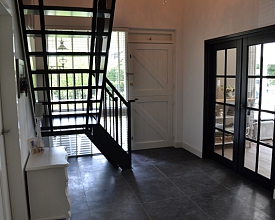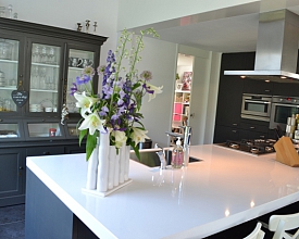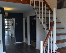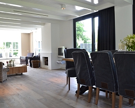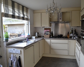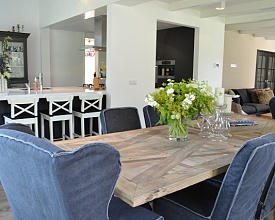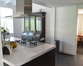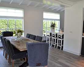 Voor deze prachtige vrijstaande woning hebben wij de gehele verbouwing gecoördineerd en tevens de styling van het interieur verzorgt. Aan de woning is over en breedte van 8 meter 2,5 meter uitgebouwd, waardoor de leefruimte in de woonkamer en keuken enorm is vergroot. Door het dak in de aanbouw zijn hoogte te laten behouden heeft dit het ruimtelijk effect nog meer vergroot en is er een prachtige lichtinval ontstaan. In de woonkamer is gekozen voor een mooie "oud gemaakte" vergrijsde eikenhouten vloer welke in de hal en keuken overgaat in hardsteen. In de keuken is een schitterend kook- en spoel eiland en een apparatenwand geplaatst. Tevens is er een doorgang gemaakt naar de speelkamer van de kinderen. De hal heeft een facelift gekregen, mooie gestuukte wanden, nieuwe trap, en de enkele deur is vervangen door dubbele openslaande deuren naar de woonkamer. Op de verdieping is de badkamer omgetoverd tot een heerlijke relaxruimte voorzien van alle gemak.